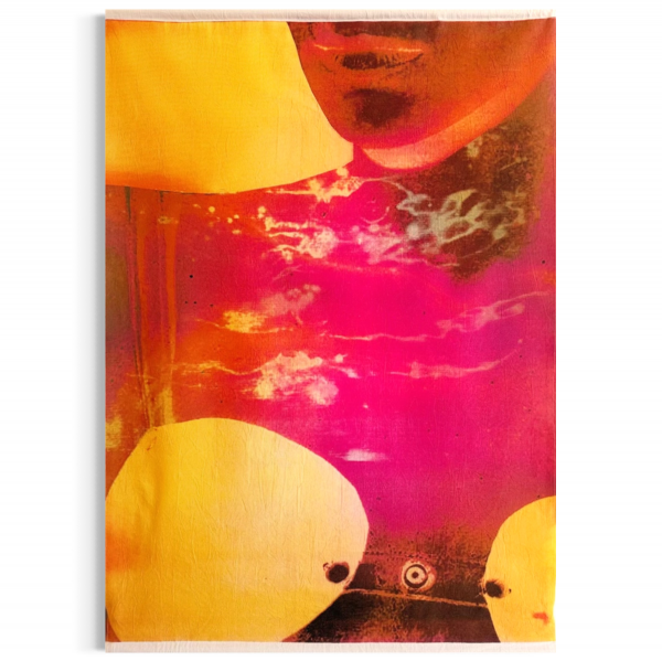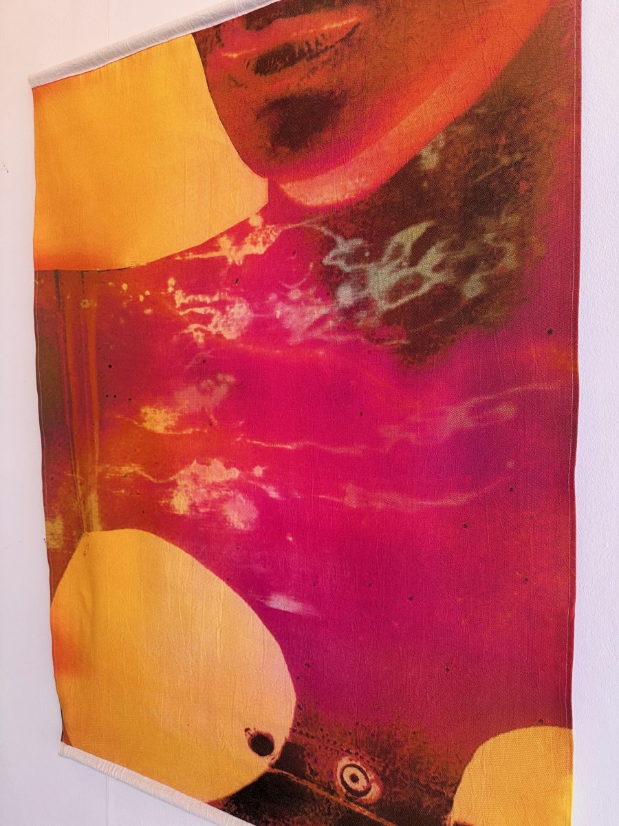 This unique collaboration is designed to be hung freely as a wall hanging, suspended with discreet aluminium poles at the top and bottom base and hung with fine transparent wire – allowing the natural folds and textures of the fabric to become part of the artwork’s presence.